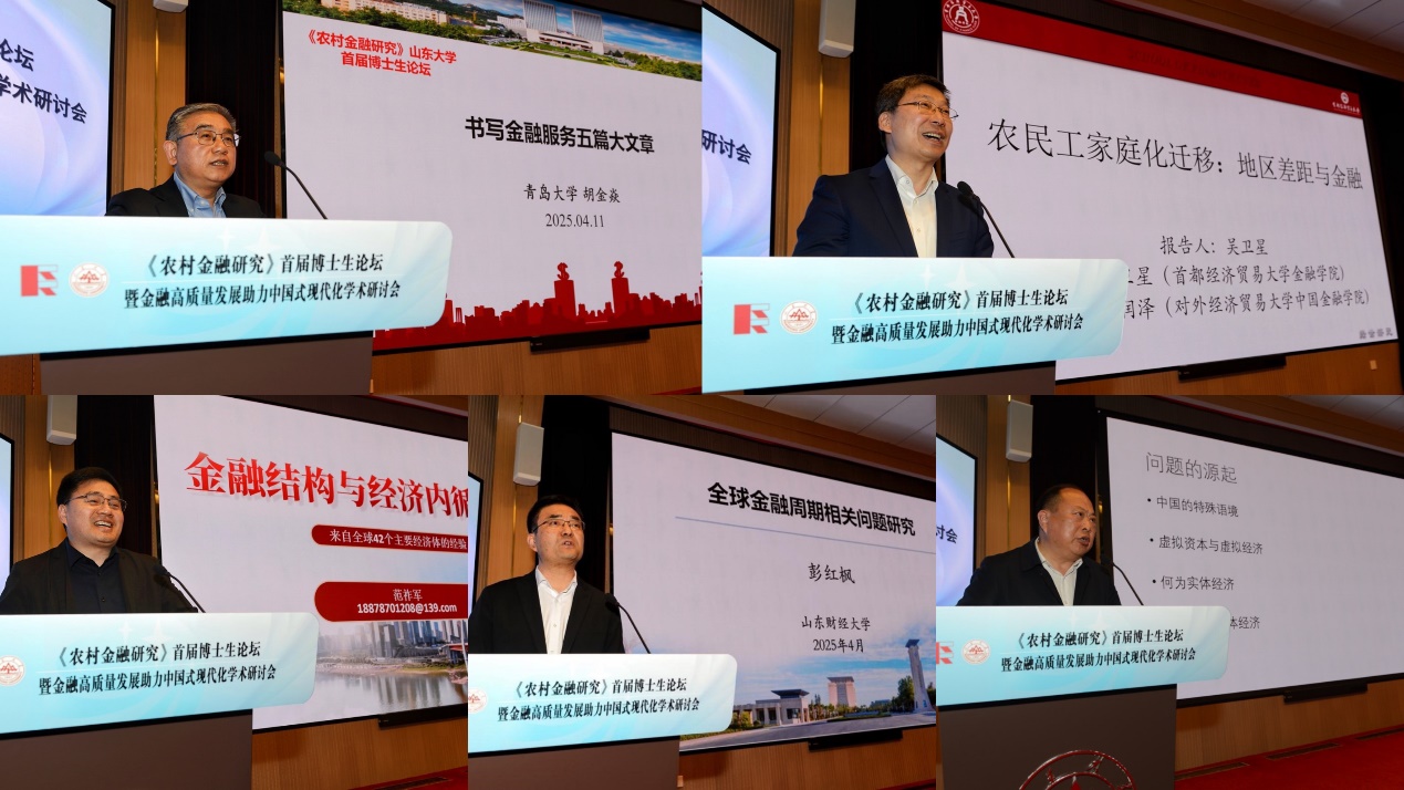 主旨报告环节,青岛大学党委书记胡金焱作“书写金融服务五篇大文章”主旨报告,从“科技金融助力科技创新”“绿色金融助力转型发展”“普惠金融助力金融服务公平”“养老金融助力养老服务体系建设”“金融科技助力数字金融发展”角度,为金融服务五篇大文章提出了切实可行的建议。首都经济贸易大学党委副书记、校长吴卫星作“农民工家庭化迁移:地区差距与金融”主旨报告,从地区经济差距和文化差异对农民工家庭化迁移的影响,农民工进行家庭化迁移时更注重地区公共服务还是发展机会,以及数字普惠金融如何助力农民工家庭化迁移三个方面进行阐述。广西财经学院党委副书记、校长范祚军作“金融结构与经济内循环增长”主旨报告,从理论和实证两个维度对金融结构对经济内循环的影响进行研究,并提出应大力发展资本市场,充分发挥外循环的正向效应,兼顾金融稳定性、效率性与服务可得性等金融功能发挥。山东财经大学党委委员、副校长彭红枫作“全球金融周期相关问题研究”主旨报告,深入阐释全球金融周期作为系统性金融风险重要驱动因素的重大研究意义,并对全球金融周期与系统性金融风险、与国际资本异常流动持续期之间的关系以及国家金融周期进行探讨。山东大学经济学院教授曹廷求作“金融服务实体经济的内涵及其创新”主旨报告,对经济与金融之间的共生共荣关系进行阐释,介绍了金融服务实体经济的理论内涵、政策内涵、理论基础,以及金融思想的重大创新。主旨报告由山东大学经济学院副院长张群姿、《农村金融研究》执行副主编张洁颖主持。