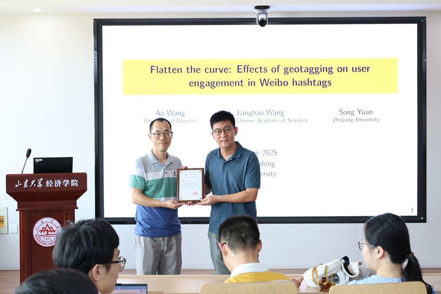 6月30日,经济学院第三十一期经济理论与政策前沿讲座于中心校区知新楼B423举行,华威大学经济学助理教授王鳌作题为“Flatten the curve: Effects of geotagging on user engagement in Weibo Hashtags”的学术报告。讲座由经济学院黄继雷老师主持,学院部分师生参会。