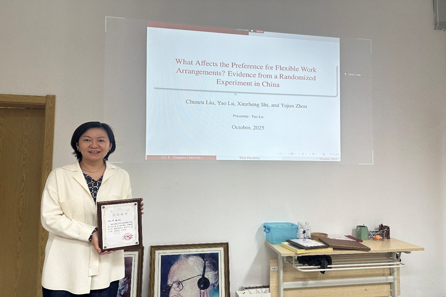 10月11日,山东大学经济学院第359期高级经济学讲座在中心校区逸夫信息楼类脑经济学研究中心举办。清华大学经管学院金融系长聘教授、教育部青年长江学者陆瑶教授聚焦主题“What Affects the Preference for Flexible Work Arrangements? Evidence from Randomized Experiments in China”受邀主讲。讲座由山东大学经济学院/类脑经济学研究中心李建标教授主持,研究中心成员及经济学院部分师生参与研讨。