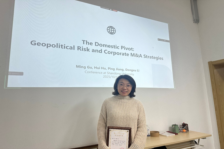 10月11日,山东大学经济学院第360期高级经济学讲座在中心校区逸夫信息楼类脑经济学研究中心举办。对外经济贸易大学金融学教授、对外经贸大学国家(北京)对外开放研究院研究员、北京ESG研究院理事江萍教授受邀作“The Domestic Pivot: Geopolitical Risk and Corporate M&A Strategies”主题讲座。讲座由山东大学经济学院/类脑经济学研究中心李建标教授主持,研究中心成员及经济学院部分师生参与研讨。