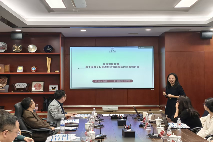 研讨会第二单元至第六单元为主题报告环节,第二单元中,山东大学国际创新转化学院刘莎莎教授通过多案例研究,探讨了国企混改子公司如何通过差异化管理模式实现市场逻辑与行政逻辑的有机耦合。研究发现,企业需根据股权结构、企业家身份及小股东资源优势,采取专业化治理、文化学习或机会驱动等管理模式,以化解制度冲突、提升协同效率,为深化混改实践提供了管理层面的具体路径。