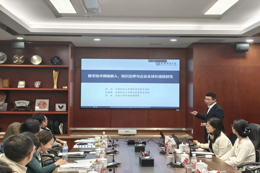 第三单元中,安徽财经大学国际经济贸易学院陈旭教授探讨了数字技术网络嵌入对企业全球价值链韧性的影响。研究发现,城市在数字技术合作网络中的中心地位,能通过拓展企业显性与隐性知识边界,显著提升其应对国际冲击的能力。研究还指出,城市间网络地位相近是知识溢出的关键,为优化区域数字协作以增强产业链韧性提供了新视角。