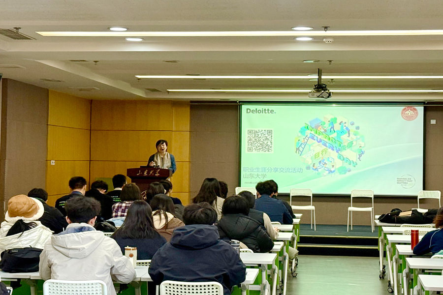 王勇结合自身跨职业、跨地域从业经历,着重指出“选择贯穿整个职业生涯”,建议同学们尽早树立职业规划意识,主动应对未来挑战。毛童琳从山东大学校友及税务经理视角回顾个人求职历程,表示职场人需培养可持续积累的核心技能,结合多行业案例分析行业周期波动对职业转型的影响,建议同学们广泛探索、拓宽认知,理性规划职业方向。王若亭分享了选择德勤的缘由,对公司开放包容的团队氛围与系统化专业成长路径表示赞许,表示“工作是学习与生活共同体”,职业稳定源于持续学习与价值提升能力。谭镇彬聚焦数字化时代发展趋势,指出人工智能等新技术对行业的革新影响,鼓励同学们主动学习、关注行业动态,积极拥抱技能更新与方法创新。多位德勤青年员工围绕职业选择、持续学习、沟通能力等方面分享求职与成长感悟。