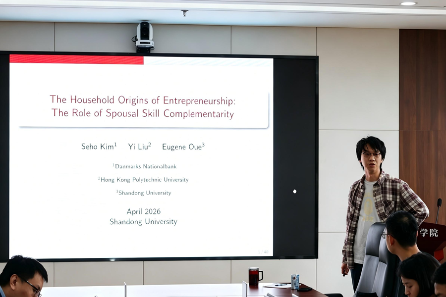 4月16日,经济学院第134期青联学术午餐会在中心校区知新楼B321举办,山东大学经济学院助理研究员欧启聪受邀作题为“The Household Origins of Entrepreneurship: the Roleof Spousal Skill Complementarity”的学术报告。讲座由经济学院副研究员邹杰主持,学院部分师生参会。