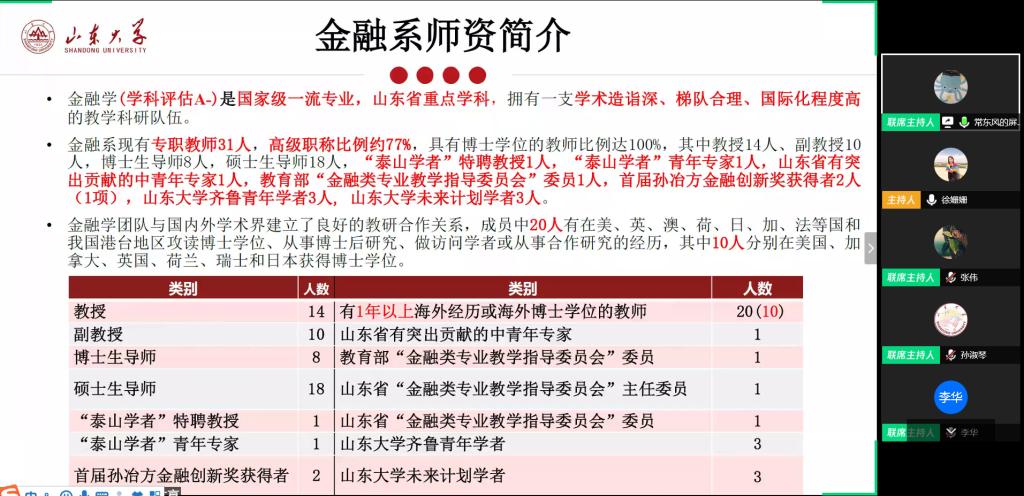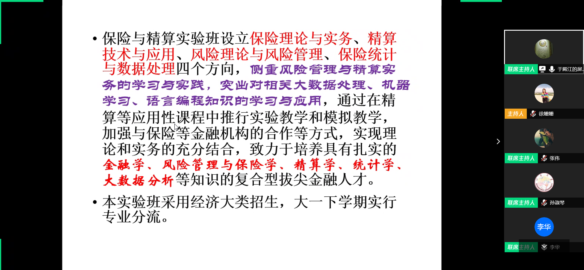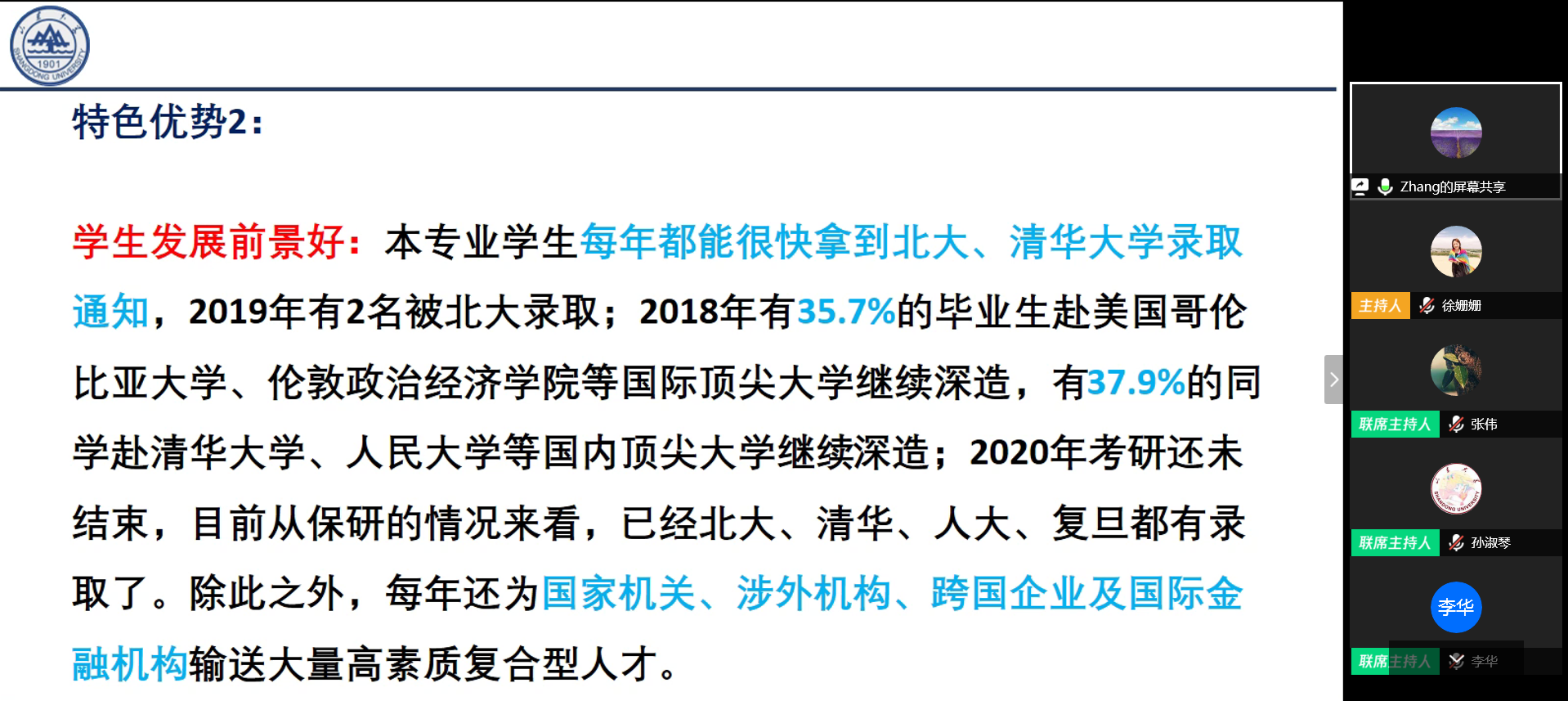宣讲会上,张伟结合经济学专业培养模式,向同学们展示了经济学系的深厚历史积淀和卓越的师资力量,重点分析了以核心课程为主干的“面向未来、引领未来”的课程设置。此外,他简单介绍了毕业生数量及去向、研究生专业设置,为同学们未来的发展提供了更清晰的指引,鼓励大家“做最好的自己”。李华从财政系的基本情况、师资团队、专业特色、学生培养质量四个方面,回答了在财政系学习“会遇到什么”“会学到什么”“会成为什么”三个问题。她着重强调了财政学专业“三跨五经历”的人才培养模式、“持久深入的社会调研”的培养特色和本科生导师制这一制度保障。她表示财政学专业未来发展前景光明,表达了同学成为财政人的期盼。张岩围绕 “培养高端研究型、复合型国际经贸专门人才”这一专业定位,指出了国贸学专业具有学科实力强、专业建设水平高、学生发展前景好、国际化程度高、专业发展水平高的特色优势。同时,她简略介绍了强大的师资力量和科研实力、不同阶段的课程设置和学生国内外交流情况,帮助同学们更好地了解国贸专业。常东风从学术造诣深、梯队合理、国际化程度高的教学科研队伍入手,展示了金融系举办的“金融论坛”“银行治理研讨会”等学术活动,表明了金融系学术科研的专业性,强调了金融系浓厚的学术氛围。她指出,金融专业旨在培养未来从事金融事务和科研的人才,希望同学精准定位,做出合适的选择。于殿江通过引用“天有不测风云,人有旦夕祸福”,介绍了保险的概念,运用生活中小概率事件的例子引出风险的含义,生动地展现了保险与精算实验班的主要研究内容。随后,他分别介绍了保险精算的主要分类和基本任务、保险精算师的工作范围及考试制度,指出目前保险精算人才供不应求的现状,展现了保险精算行业的巨大潜力。同时,各位老师也有针对性地分析了各专业出国留学和推免保研情况。在问答环节,就家长、学生提出的专业选择问题,各位老师及时给予回复。
