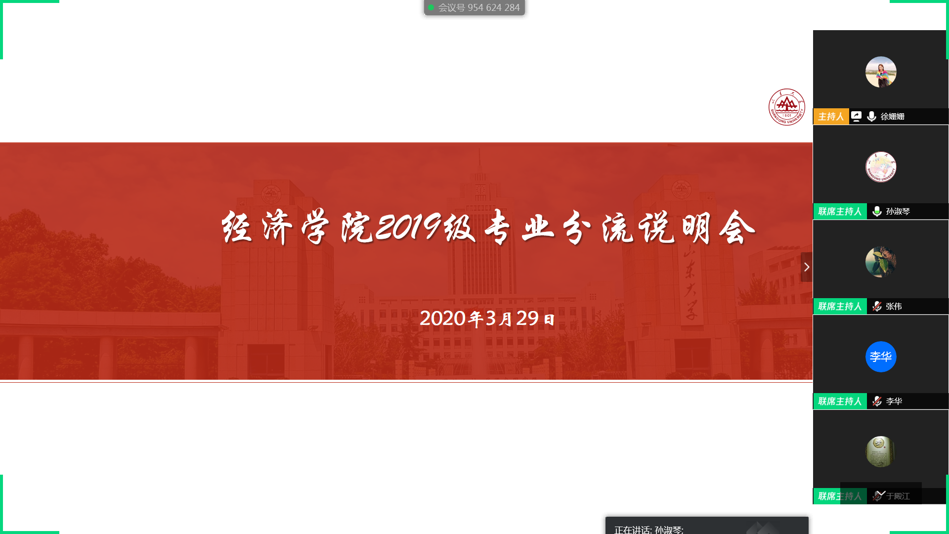 3月29日下午,经济学院2019级专业分流说明会通过线上会议举行。经济学院副院长孙淑琴、经济学系主任张伟、财政学系主任李华、国际经济与贸易系主任张岩、金融学系主任常东风、风险管理与保险学系党支部书记于殿江参加会议并依次进行专业宣讲。