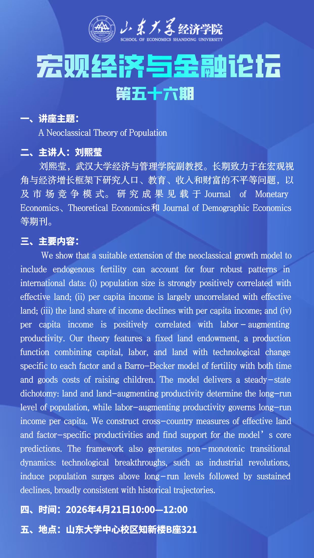 A Neoclassical Theory of Population(宏观经济与金融论坛第五十六期)