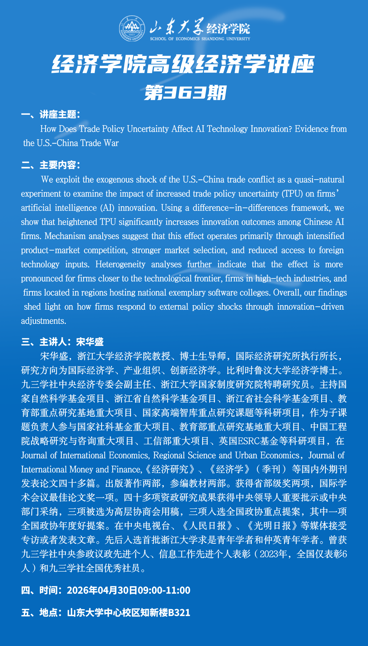 How Does Trade Policy Uncertainty Affect AI Technology Innovation? Evidence fromthe U.S.-China Trade War(经济学院高级经济学讲座第363期)