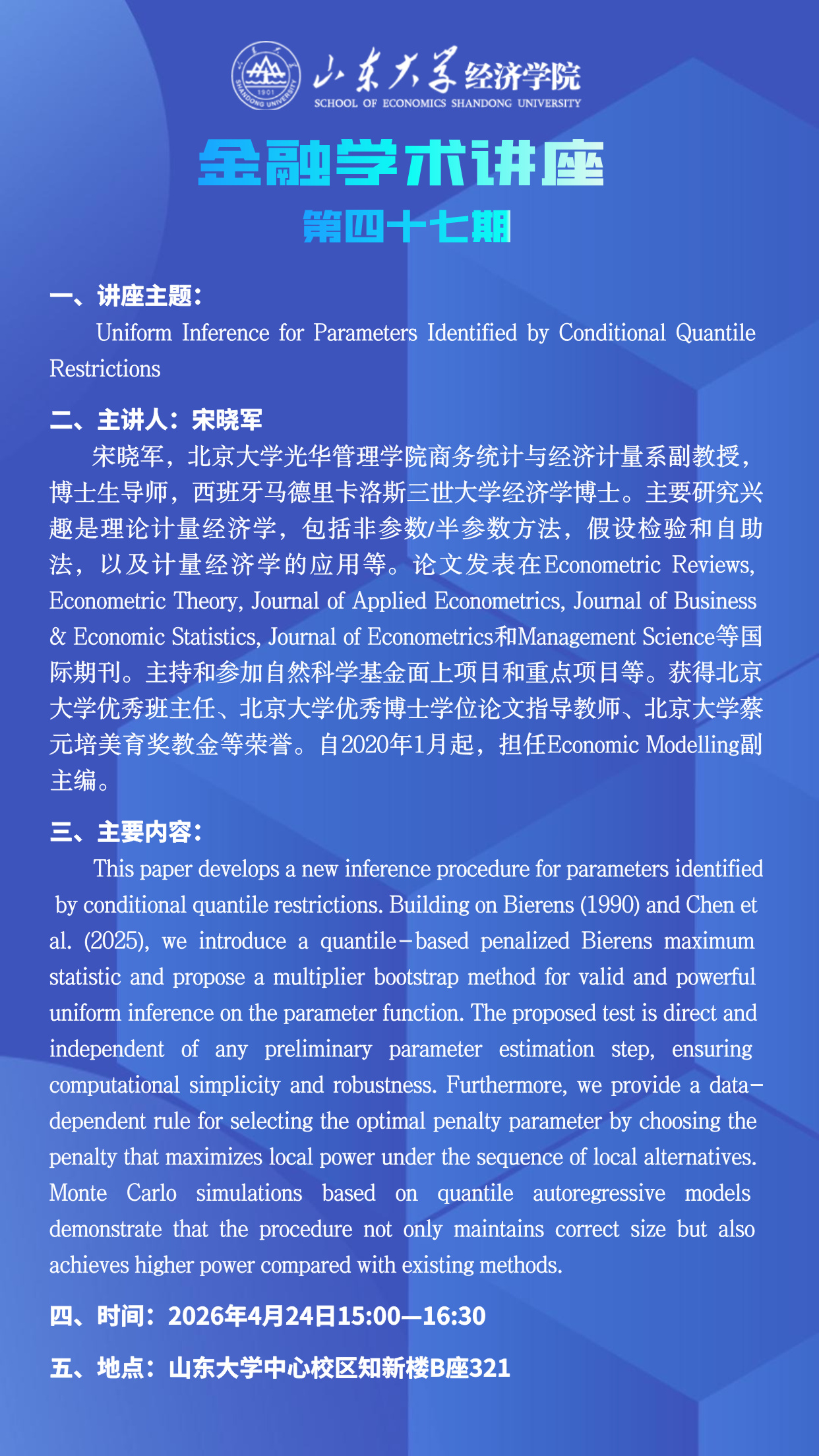 Uniform Inference for Parameters Identified by Conditional Quantile Restrictions(金融学术讲座第四十七期)