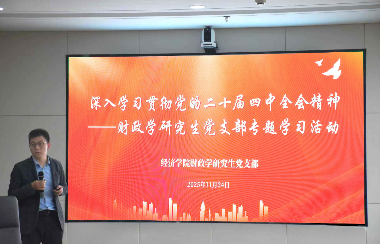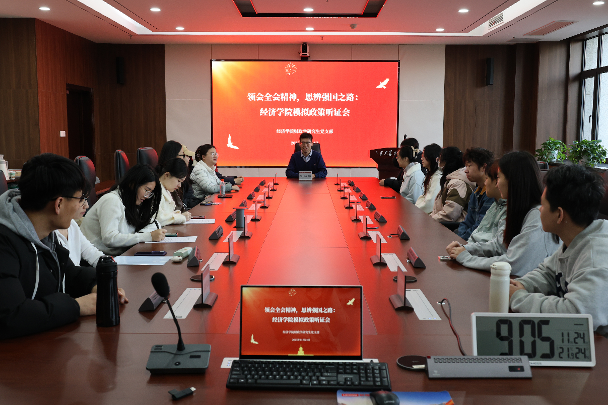 为深入学习贯彻党的二十届四中全会精神,充分发挥研究生党建“双百”“双十”示范引领作用,11月24日,经济学院财政学研究生党支部开展模拟政策听证会主题党日活动。此次活动以“领会全会精神,思辨强国之路”为主题,经济学院财政学研究生党支部全体党员、财政系教师党支部党员代表参加活动。