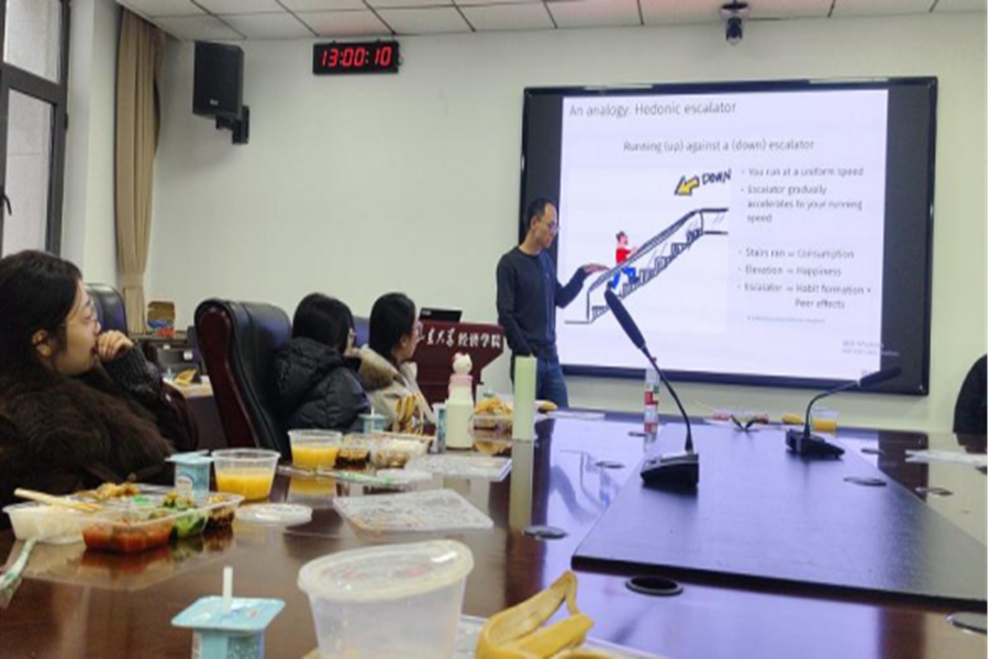 学术探讨环节,周剑南围绕“收入越高越幸福吗”核心问题,详解“伊斯特林悖论”,重点剖析习惯形成、同伴效应机制,以“下行电梯中向上奔跑”为喻,阐释短期收入增长与长期幸福感的关系,指出应跳出单一财富积累目标,通过健康人际、有意义工作等构建持久满足感。