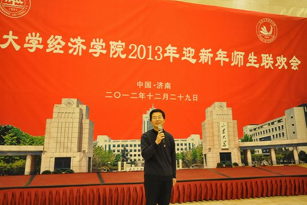 2012年12月29日,经济学院2013迎新年师生联欢会成功举办。经济学院院长李长英、党委书记陈宏伟等学院领导、离退休教师、全体教职工和学生代表100余人参加了联欢会。此外,中组部专家、山东大学博弈论与经济行为研究中心主任秦承忠教授,1978级校友、山东珍宝谷酒业有限公司董事长王智太先生应邀参加了师生联欢会。