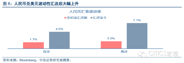 为什么日元升值后的快速贬值会导致这样的后果?首先,日元的贬值超出了当时的市场预期,用菊地悠二的话而言就是“不可预测的日元贬值”,启示是,当市场做空力量被当局强行压制已久的情况下,突然发生超预期的货币贬值,将会极大造成市场恐慌;其次,恐慌造成市场上没人知道日元将会贬到何处,单边贬值预期形成,并进一步演化成“日本贬值就是日本经济虚弱象征”的认识,最终导致恐慌由汇市向股市等其他市场蔓延,最终形成抛售日本的风潮,对我们的启示是,应当避免单边贬值预期的形成,防止恐慌的蔓延,避免形成抛售风潮;再次,日本贬值的速度失控,在十年的日元升值期间,年均升值速度为10%,但在恐怖的贬值时间里,年均贬值速度高达15.7%。人民币汇率将何去何从? 我们认为“有序贬值”仍将是人民币兑美元汇率接下来的路径,同时汇率波动性将继续加大,我们预计未来一年贬值幅度为个位数,5%或稍多,超过10%可能性较小。如前所述,快贬并不可取。CFETS人民币新篮子过去3个交易日的走势基本稳定,反映央行或许不一定要激进调低人民币对一篮子货币汇率。同时,央行或将通过提升汇率的波动性,打破市场形成单边贬值预期,减少套利机会。年初到8月11日汇改前在岸美元/人民币即期汇率年化波动性为1.8%,汇改后已经上升为4.6%,离岸汇率7.1%(图6)。但与新兴亚洲货币汇率相比,人民币汇率波幅还不算大。