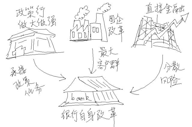 但现实表明,这三家银行实力不足,无法把政策性任务全接走。2014年末,开行、口行、农发行总资产分别为10.3万亿元、2.4万亿元、3.1万亿元,三者合计不到16万亿元,占全部银行业总资产(172.3万亿元)为9%,占比很低。但就在上个月,有消息称,央行已向开行注资480亿美元,向口行450亿美元(此前则分别注资过320亿美元、300亿美元),财政部则向农发行注资1000亿元人民币。我们预计,随着这类机构发展壮大,承担政策性任务的能力越来越强,商业银行可逐步从政策性任务中脱身,从政府干预中脱身。2改革国有企业 国企目前仍然是银行的最大客户群体。一个巴掌拍不响,如果它们未改革,经营机制落后,经营效益恶化,那么银行改革肯定也改不到哪去。所以,目前举国上下关注国企改革,虽然路途艰辛,但它确实是银行改革过程中绕不过的坎。客户好了,银行才能好。3发展直接金融 鼓励企业直接融资,也鼓励居民投资这些新型金融工具。这简直是老生常谈了,投融资渠道多元化,别啥事都放银行,风险集聚。当然,这并不意味着银行就被淘汰了,银行也可继续为直接金融服务,比如资产证券化、资产管理等。 还有一点就是银行自身公司治理的改革。但这一点并不是难点。只要上述三点完成了,银行自身的改革是水到渠成之事。 我们用一幅图概括这一全景: