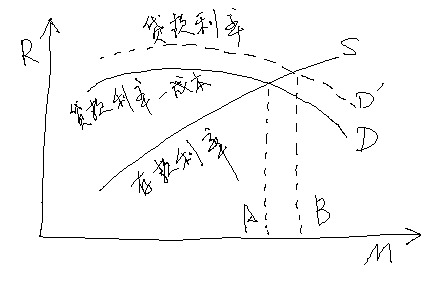 罗纳德·麦金农在其经典著作中解释了这个均衡值。我们将其模型简化描述。银行的生意,是收贷款利率,先扣存款利率,再扣各项成本率,最后是其利润。贷款利率 – 存款利率 – 各项成本率 = 利润率 如果我们把合理利润看成股东的资本成本,包含到成本里,那么上式中的右项就成了“超额利润”。贷款利率 – 存款利率 – 各项成本率(包含股权成本) = 超额利润率 按照微观经济学原理,完全竞争市场中,超额利润为零。所以:贷款利率 – 存款利率 – 各项成本率(包含股权成本) = 0 再变换一下,右移:贷款利率 – 各项成本率(包含股权成本)= 存款利率 也就是说,等号左右两项相等时,达到均衡,M2/GDP的升势也就到头。 然后开始画图。S是存款曲线,假设存款利率越高,老百姓就存更多钱(所以曲线朝右上方)。D是“贷款利率-成本率”的线,利率越低(假设成本率固定),大家会贷更多钱(所以曲线朝右下方)。两线相交处就是满足“贷款利率–各项成本率(包含股权成本)=存款利率”条件的地方,对应的货币量A点就是最优的货币化率。