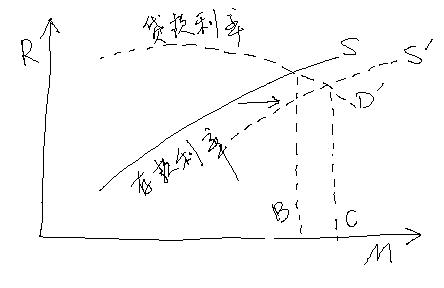 1高储蓄率 社保不完善,养老教育医疗要花钱,我们每月领的工钱不敢乱花,要存起来,因而国家消费、投资不给力。高储蓄率意味着S线向右平移到S’,最优货币量从B点右移到C。