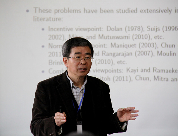 国家特聘教授、山东大学博弈论与经济行为研究中心主任秦承忠作了开幕式致辞,向各位参会代表介绍了山东大学博弈论与经济行为研究中心最近几年来在人才引进以及学科建设上的成果,向各位代表的到来表示衷心的欢迎。“RCGEB Workshop”是山东大学博弈论与经济行为研究中心举办的系列高水平小型学术研讨活动,迄今已成功举办6次。应邀参加本次会议的有Journal of Economic Behavior and Organization主编、美国田纳西大学William S. Neilson教授,韩国首尔国立大学Young-Sub Chub教授,韩国首尔国立大学Biung-Ghi Ju教授,早稻田大学的Shuige Liu研究员,台湾中央研究院杨春雷教授,上海财经大学Adam Wong教授、郑炳勇教授,对外经贸大学李建培教授,新加坡国立大学Yifei Sun博士,意大利威尼斯东方大学王石磊博士,中山大学Bin R. Chen博士,河南大学董保民教授等专家学者,他们和山东大学博弈论与经济行为研究中心、山东大学经济学院的诸位学者在两天的时间里共进行了15场专题报告与讨论交流,取得了丰硕的成果。