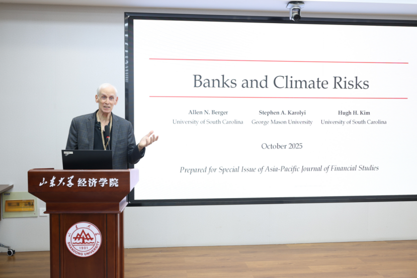 主旨演讲环节由张群姿教授、南开大学金融学院院长范小云教授和山东大学经济学院常东风教授共同主持。Allen Berger教授以“Banks and Climate Risks”为题,从气候风险的物理与转型两个维度分析其对全球金融体系的影响;胡金焱教授以“金融治理伦理的启示”为题,探讨了金融治理与中华优秀传统文化的融合路径;曹廷求教授则围绕“结构性产出缺口与货币信贷政策新功能”进行了深入阐述。