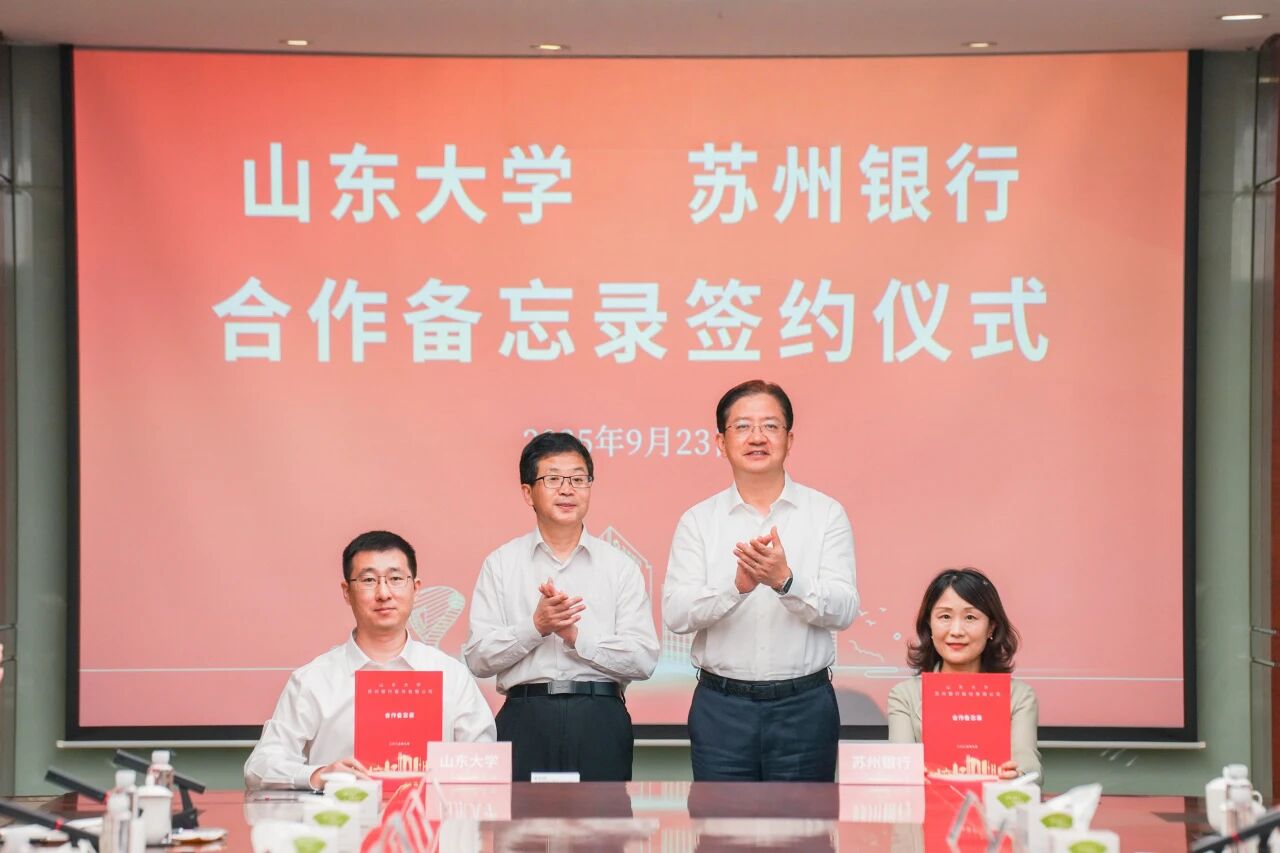 2025年9月23日,山东大学与苏州银行合作备忘录签约仪式在苏州银行举行。山东大学党委副书记陈宏伟,苏州银行党委书记、董事长崔庆军出席仪式并致辞。山东大学经济学院副院长、海归教师党支部书记张群姿教授作为学院代表参加此次活动。